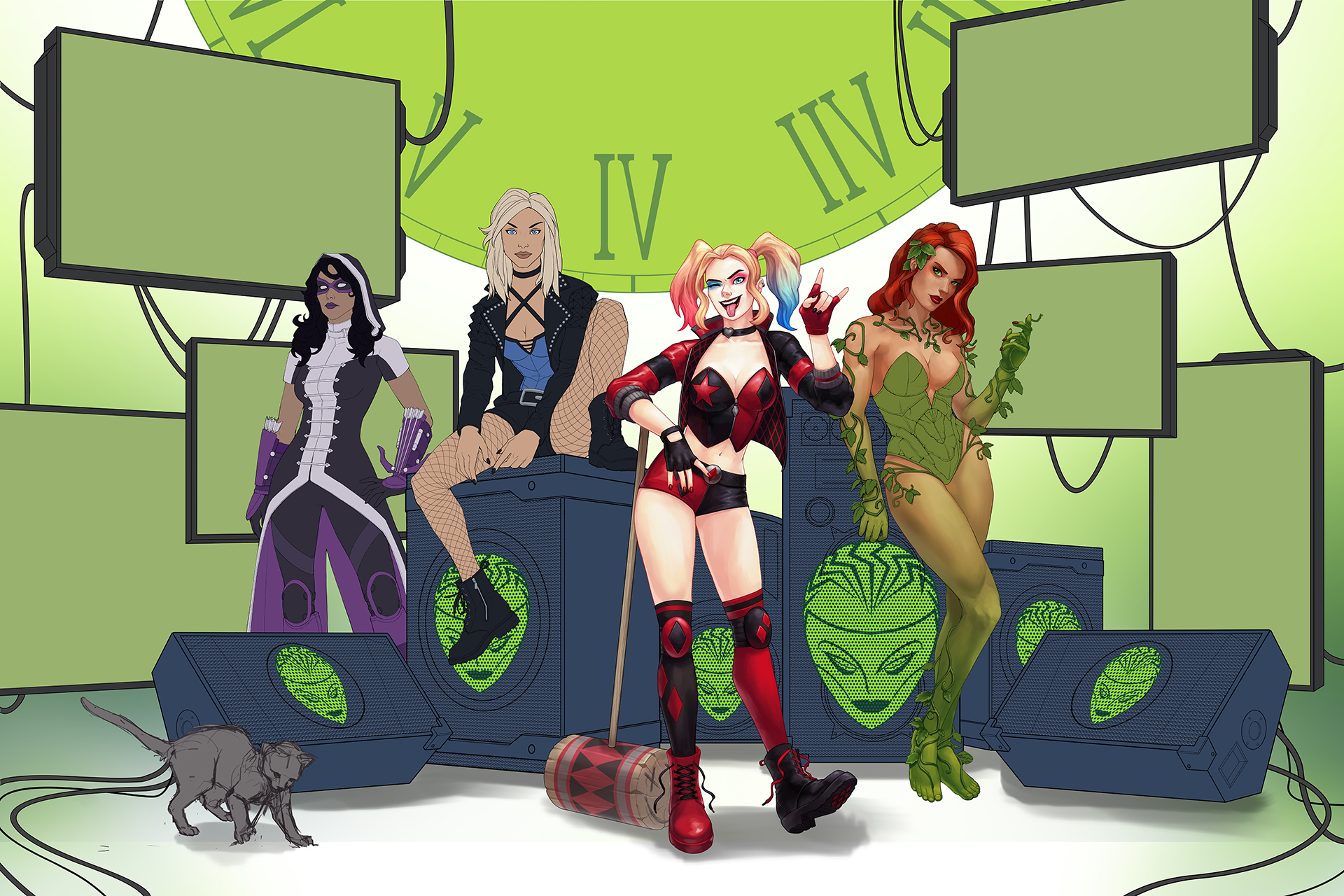 It was overall a little too silly for what we wanted for this particular key art. I only had one action sketch since that wasn’t really what we were going for, but I wanted to throw it out there just to see. Since Black Canary is a singer in the comics, I liked the idea of “GIRL BAND” for this set of characters. Using the speakers as the main environment element allowed us to go more pin-up and “graphic design” rather than a literal location.