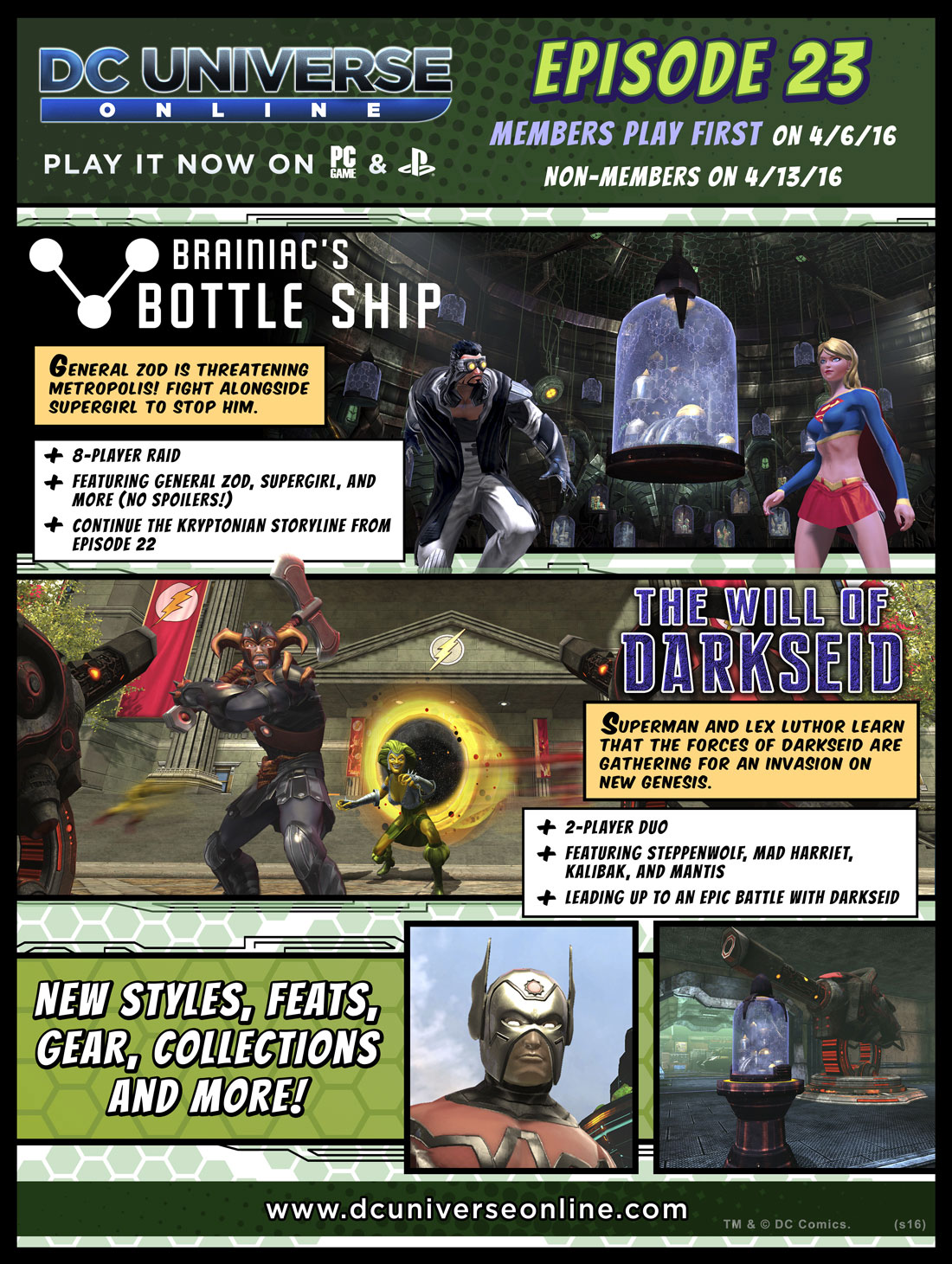 Lois may have temporarily halted General Zod from getting the coordinates of Brainiac’s Bottle Ship, but now Zod is holed up in the top room of Lex Luthor’s Science Spire and is threatening to attack the city of Metropolis! Meet with Supergirl find a way to remedy the situation in the new 8-Player Operation: Brainiac’s Bottle Ship! Gain access to new feats, collections and gear! Free to access for Members!