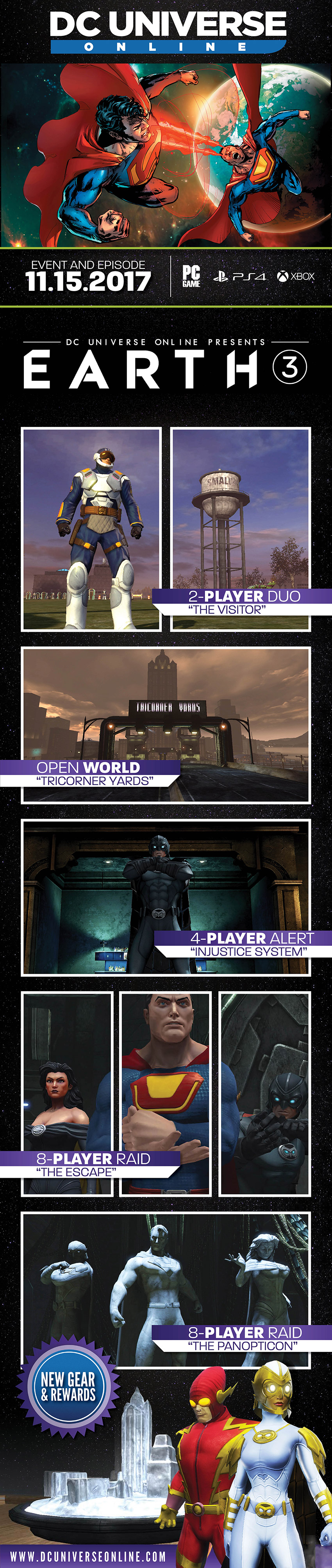 Earn new feats, discover new collections, and fight for new high-level gear inspired by Owlman and Johnny Quick! To get started, look for Earth 3 in your Mission Journal. End-game and Elite content requires a Combat Rating of 207, and is free to access for Members or available for purchase. Event content requires level 10, and is available to all players for a limited time.