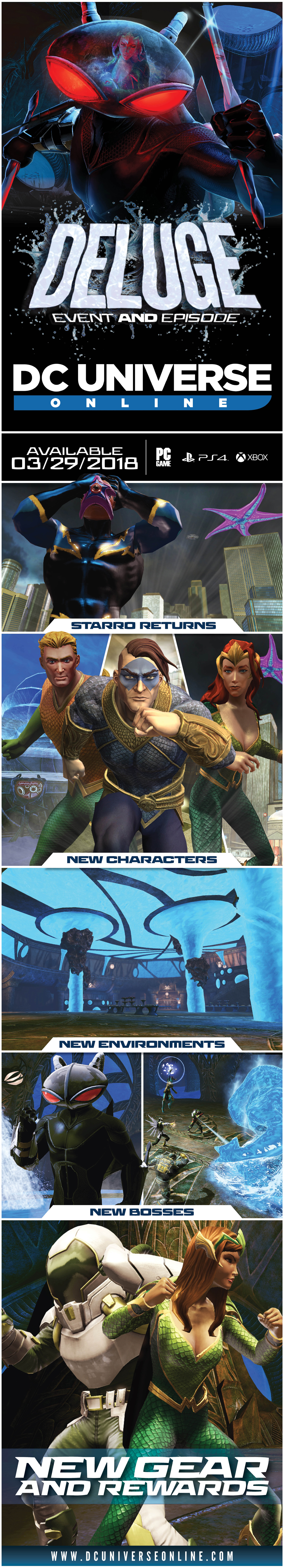 Starro returns to invade DC Universe Online once again in Deluge! Heroes and villains alike must band together and resist its influence before it’s too late! You’ll need to fight your way through this alien intrusion, from the chaotic streets of Central City to an isolated Atlantean Research Outpost, in an effort to discover the source of the invasion and how to stop it! Though this time, there may be more lingering beneath the surface of this invasion, and you may need to journey to Spindrift Station to clear the waters on what is really going on.