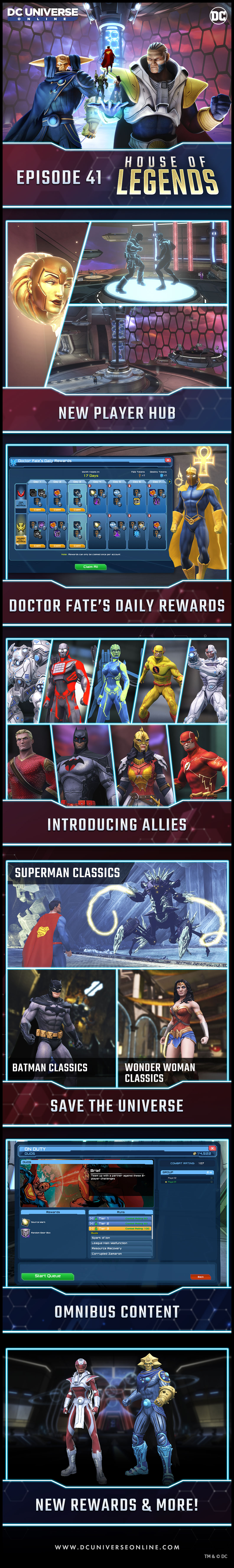 House of Legends features this new shared hub, an updated On Duty menu with Quick Play missions, Omnibus scaling content with full rewards and with no loot locks, Save the Universe up-leveled classic content, the Allies system, new rewards, access level upgrades, Doctor Fate's Daily Rewards, and more.