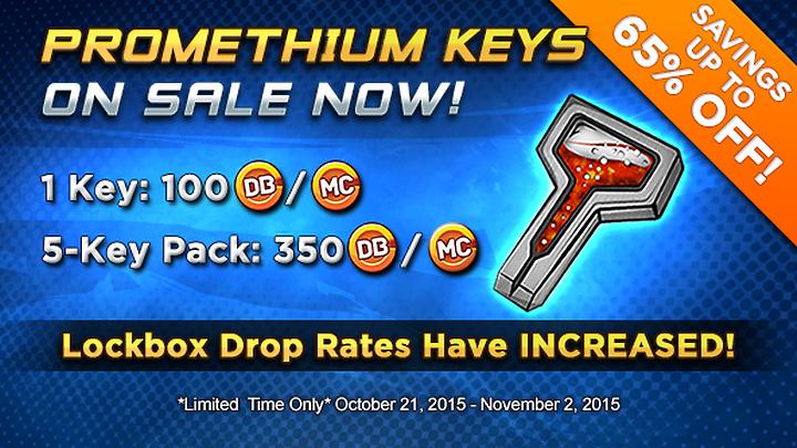 We have slashed the prices on Promethium Keys! Starting October 21, 2015, get one key for just 100 Daybreak Cash / Marketplace Cash, or save even more with the 5-Pack for just 350 Daybreak Cash / Marketplace Cash. Stock up now so you too can get in on the style items, base items, Marketplace consumables, and Compound Omega buff consumables found in Promethium Lockboxes.