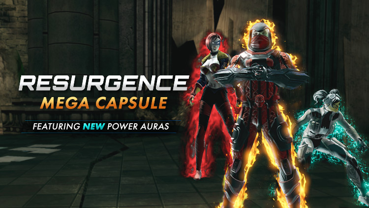 We are pleased to introduce the new Resurgence Mega Capsule and powerset auras! The Resurgence Mega Capsule will begin dropping in-game on March 22, 2018 (opened with Stabilizers) AND at the same time will be available for purchase directly in the Marketplace. This is your chance to catch up on past Time Capsules, take advantage of a huge discount while doing so, and collect 17 ALL NEW auras inspired by DCUO's fifteen different powersets.