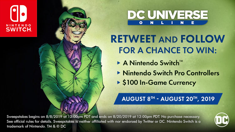 DC Universe Online is out now on Nintendo Switch, so celebrate in the #DCUOonNintendoSwitch Sweepstakes! All you have to do is follow the official @DCUO Twitter page and then retweet any of the official Sweepstakes tweets that you find there. Look for the hashtag #DCUOonNintendoSwitch or #sweeps.