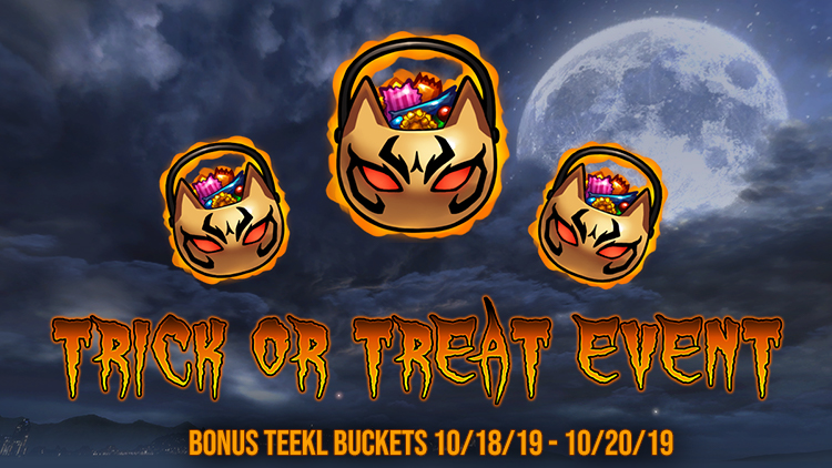 Happy Trick or Teekling! During the Trick or Treat event, all players receive three Teekl Buckets each day (every 24 hours). This weekend, we're doubling your buckets, so you will see SIX Teekl Buckets in your grants window every day. Get double the buckets, find candy, and get even more of those sweet, sweet Halloween rewards!