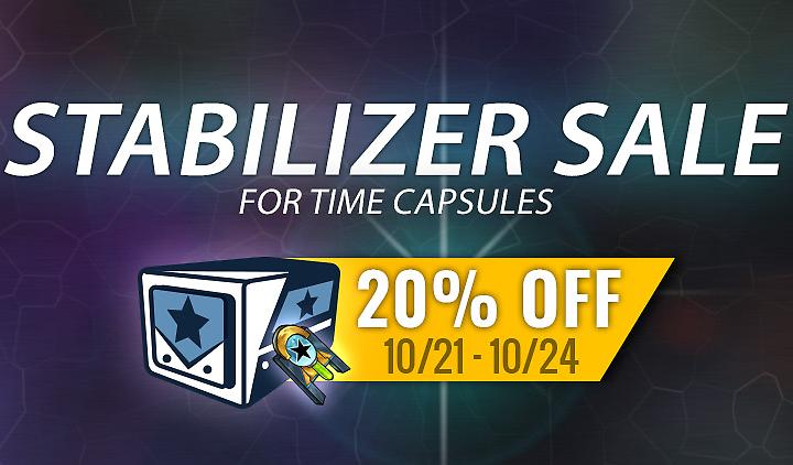 From Friday, October 21, 2016 through Monday, October 24, 2016, Stabilizers – which are required in order to open up a Time Capsule – are on sale in the Marketplace for 20% Off! This means a Stabilizer will cost just 80 MC/DBC and a pack of 20 Stabilizers will cost just 1,520 MC/DBC.